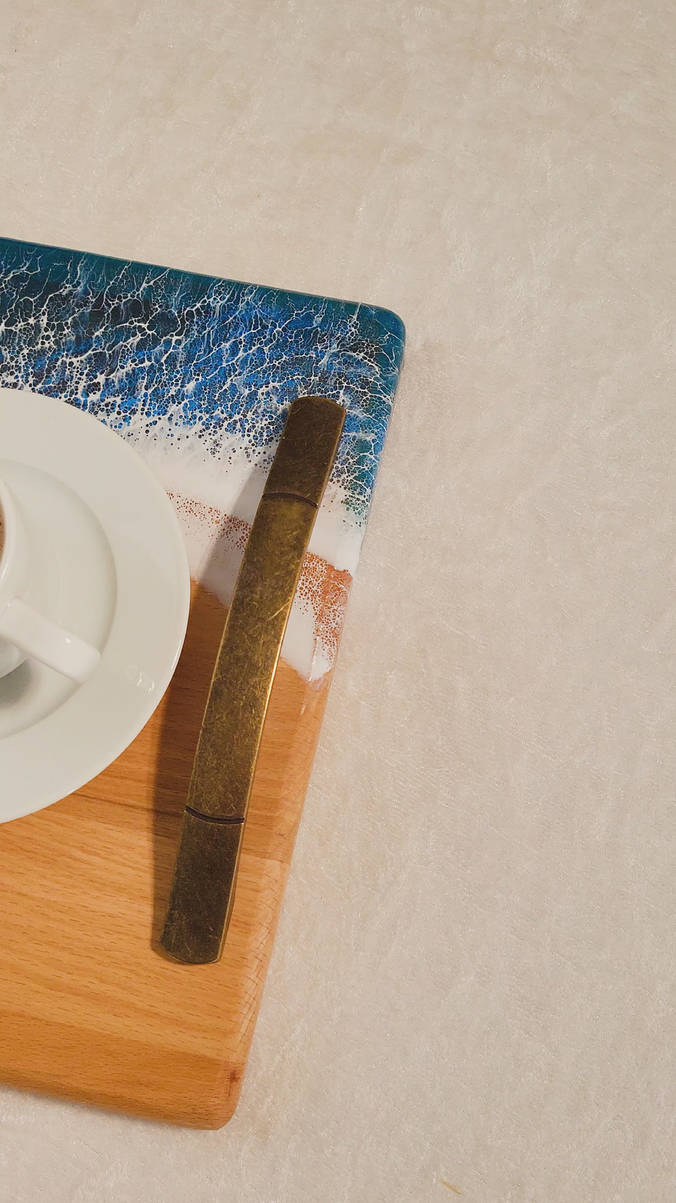 Deniz esintisini sofraya taşıyan bu epoksi okyanus dalga desenli ahşap sunum tepsisi, kahve, çay servislerinize şık bir dokunuş katar.